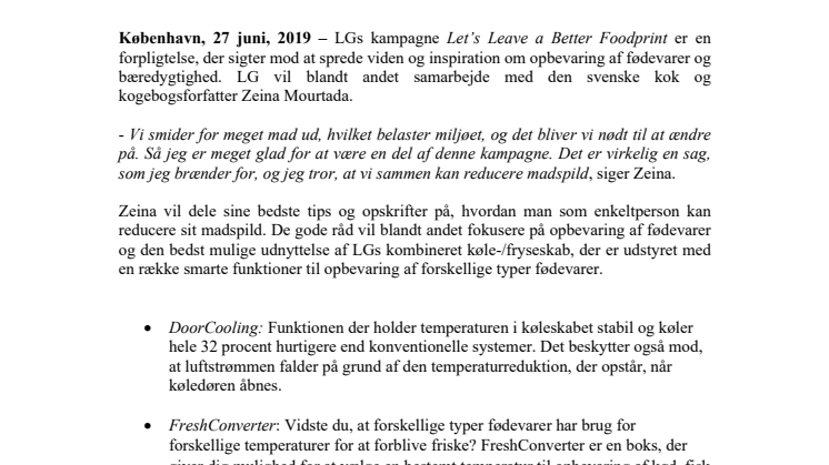 LGs kampagne Let’s Leave a Better Foodprint er en forpligtelse, der sigter mod at sprede viden og inspiration om opbevaring af fødevarer og bæredygtighed. LG vil blandt andet samarbejde med den svenske kok og kogebogsforfatter Zeina Mourtada.