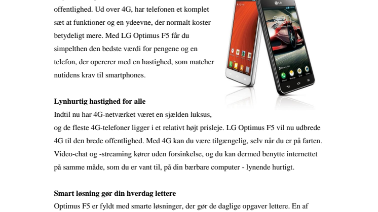 København, 28. maj 2013 – LG Electronics udgiver nu Optimus F5, en 4G telefon til den brede offentlighed. Ud over 4G, har telefonen et komplet sæt at funktioner og en ydeevne, der normalt koster betydeligt mere. Med LG Optimus F5 får du simpelthen den bedste værdi for pengene og en telefon, der opererer med en hastighed, som matcher nutidens krav til smartphones.