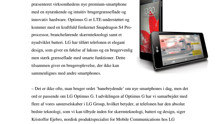KØBENHAVN, 19. september, 2012 – LG har nu præsenteret virksomhedens nye premium-smartphone med en nytænkende og intuitiv brugergrænseflade og innovativ hardware. Optimus G er LTE-understøttet og kommer med en kraftfuld firekernet Snapdragon S4 Pro-processor, brancheførende skærmteknologi samt et nyudviklet batteri. LG har tilført telefonen et elegant design, som giver en følelse af luksus og en brugervenlig men stærk grænseflade med smarte funktioner. Dette tilsammen giver en brugeroplevelse, der ikke kan sammenlignes med andre smartphones.