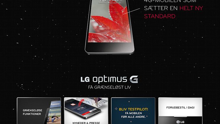 KØBENHAVN, 29. januar, 2013 – Snart er det tid til lanceringen af LG's nye supertelefon LG Optimus G. Før telefonen bliver tilgængelig for offentligheden, får et antal testpiloter mulighed for at skubbe grænserne for, hvad en rigtig god smartphone med 4G er i stand til. På www.optimusg.dk kan potentielle testpiloter, argumentere for, hvorfor netop de, bør være en af de 30 udvalgte til at modtage et eksklusivt eksemplar af LG Optimus G før den kommer i butikkerne.