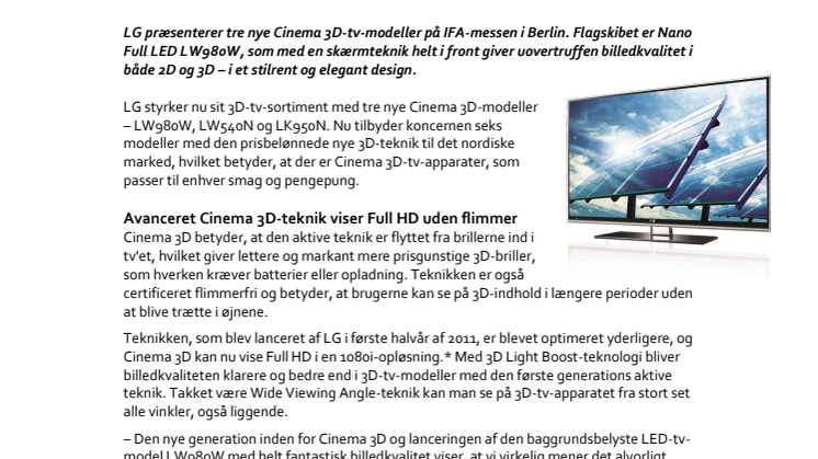 LG styrker nu sit 3D-tv-sortiment med tre nye Cinema 3D-modeller – LW980W, LW540N og LK950N. Nu tilbyder koncernen seks modeller med den prisbelønnede nye 3D-teknik til det nordiske marked, hvilket betyder, at der er Cinema 3D-tv-apparater, som passer til enhver smag og pengepung.