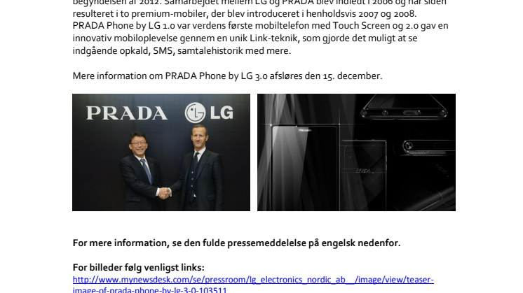 I dag fornyede PRADA og LG sit eksklusive partnerskab inden for smartphones. Partnerskabet bygger på det fremgangsrige samarbejde fra tidligere, og sammen har de to virksomheder nu udviklet PRADA phone by LG 3.0, en smartphone, der lanceres i begyndelsen af 2012. Samarbejdet mellem LG og PRADA blev indledt i 2006 og har siden resulteret i to premium-mobiler, der blev introduceret i henholdsvis 2007 og 2008. PRADA Phone by LG 1.0 var verdens første mobiltelefon med Touch Screen og 2.0 gav en innovativ mobiloplevelse gennem en unik Link-teknik, som gjorde det muligt at se indgående opkald, SMS, samtalehistorik med mere.