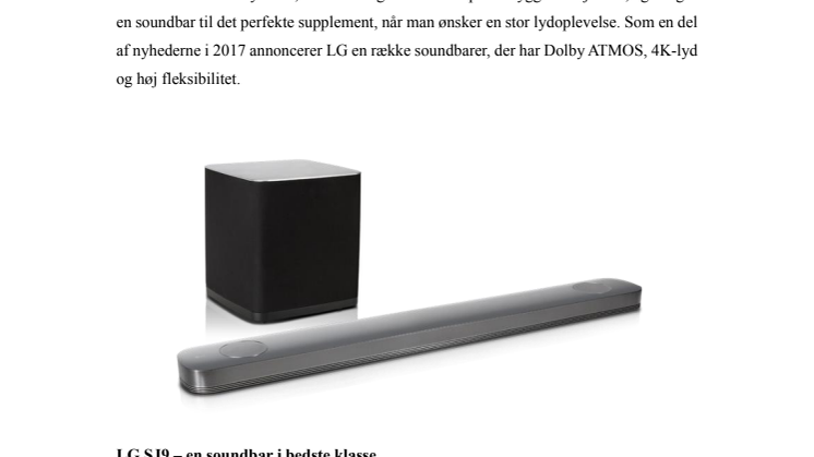 KØBENHAVN, den 3. januar 2017 ― Teknologiudviklingen inden for hjemmebiografer går rygende stærkt, både hvad angår lyd- og billedkvalitet. I takt med at tv-skærme bliver tyndere, reduceres også størrelsen på indbyggede højtalere, og det gør en soundbar til det perfekte supplement, når man ønsker en stor lydoplevelse. Som en del af nyhederne i 2017 annoncerer LG en række soundbarer, der har Dolby ATMOS, 4K-lyd og høj fleksibilitet.
