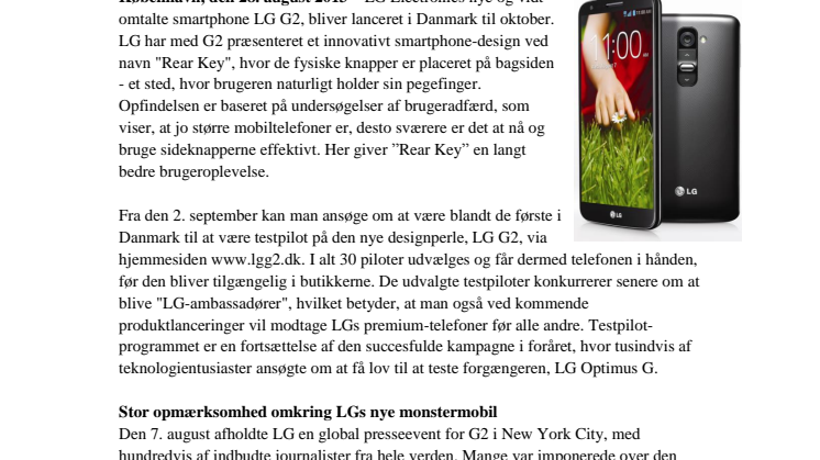 Vil du være en af de første til at afprøve supertelefonen LG G2 i Danmark? Så tilmeld dig allerede dag på www.lgg2.dk- testpilotprogrammet starter den 2. september.