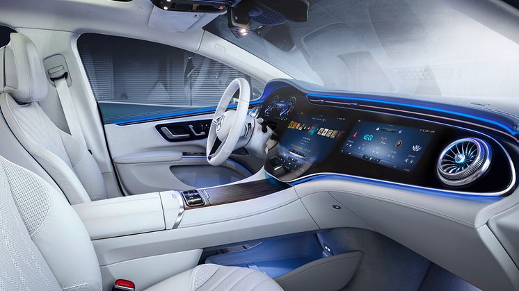 MBUX Hyperscreen er et af kabinens absolutte højdepunkter. Det store, buede og ekstremt detaljerede skærmunivers, som smyger sig på tværs af instrumentpanelet, når næsten fra A-stolpe til A-stolpe og byder på ikke færre end tre skærme, som visuelt smelter sammen til én. Forsædepassageren har sågar sin egen 12,3” OLED-skærm, som gør det muligt at styre et bredt udvalg af komfort- og underholdningsfunktioner, der specifikt henvender sig til lige netop denne position. Og hvis kabinens intelligente kamera-teknologi registrerer, at føreren kigger på passagerdisplayet under kørslen, dæmpes displayet automatisk.