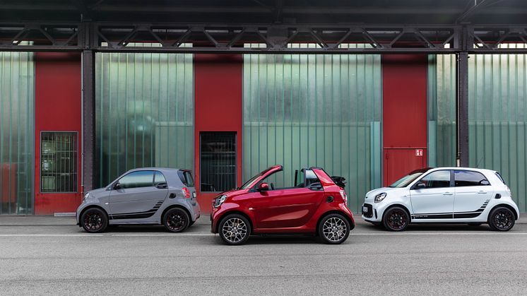 Med sit særlige og kompakte design repræsenterer modellerne fra smart selve symbolet på livet i byen, hvor pladsen er sparsom og behovet for mobilitet stort. Og det er netop i byen, hvor de tre nye modeller fra smart mere end nogensinde er på hjemmebane. For udover at kunne klemme sig ind på parkeringspladser, som andre bilister kun kan drømme om, er hele modelprogrammet nu 100 % elektrisk, da benzinmotorerne helt udgår. Foruden smart EQ fortwo coupé med fast tag omfatter udvalget også smart EQ fortwo cabriolet samt smart EQ forfour – der er lidt større og med bagsæde.