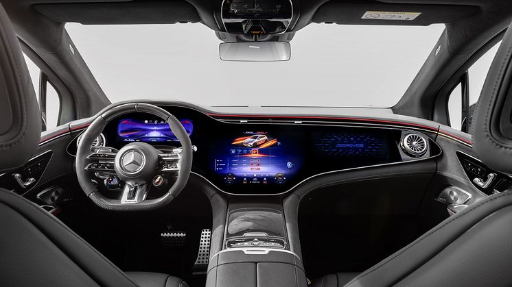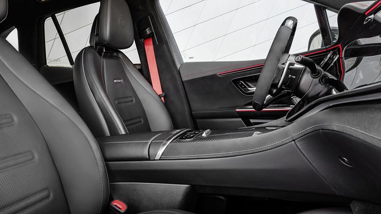 Interiøret sætter ligeledes en frisk stemning med dybe sportssæder med særlig AMG grafik i ARTICO læder med MICROCUT mikrofiber og røde syninger samt AMG Performante sportsrattet i nappalæder med den karakteristiske flade bund, de perforerede greb og sølvfarve paddles til skift mellem de forskellige rekuperationsniveauer. MBUX systemet byder desuden på en særlig AMG grafik.