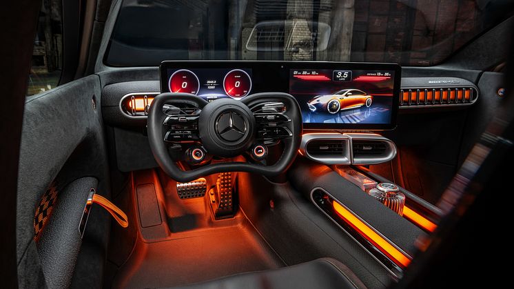 Indvendigt regerer minimalisten, hvor føreren mødes af kun det mest essentielle – ligesom i motorsport. Bilen bevarer det luksuriøse udtryk gennem eksklusivt materialevalg, og indholdet på de to skærme giver overblikket med den vigtigste information om kørsel og drivlinje.