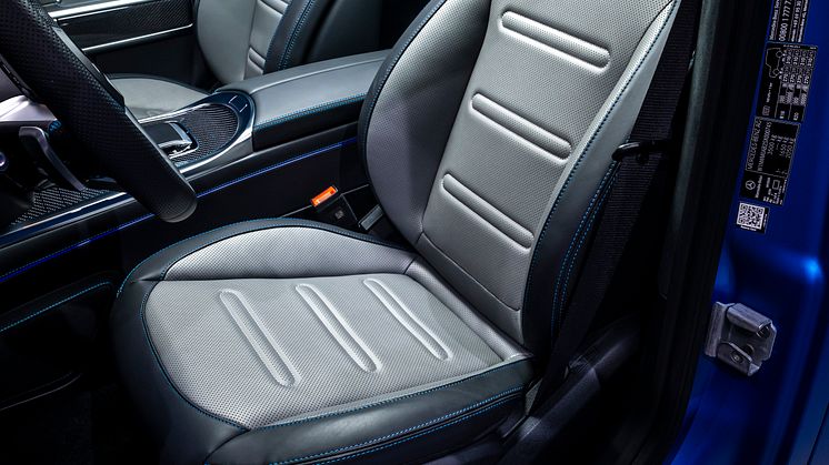 Udvendigt leveres bilen med AMG Night-pakken, som giver bilen et endnu mere råt og sportsligt udseende med mørke detaljer. Dertil har bilen bremsekalibre i lakeret blå farve, som går igen i sideskørterne, som leder hen til de 20” store AMG-letmetalfælge i 10-eget aerodesign.