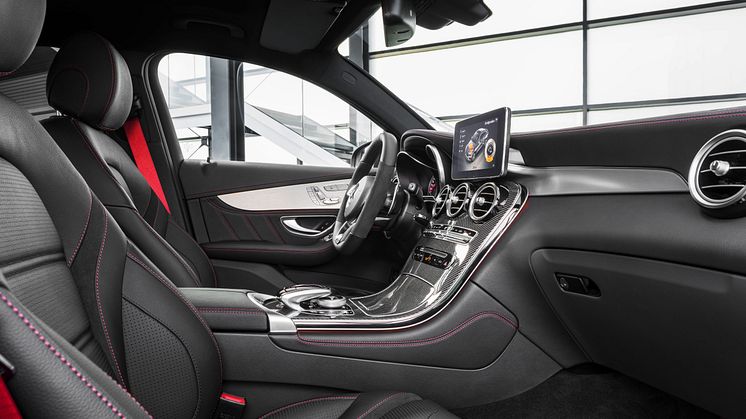 GLC 43 4MATIC Coupé står ud fra mængden med det genkendelige design, som integrerer den karakteristiske diamant-grill og velkendte AMG-front i krom. Coupé-silhuetten komplimenteres af de brede skuldre, hvis proportioner giver GLC Coupéen et dynamisk udseende. Interiøret følger AMG-traditionen med de røde kontrast-detaljer, sorte multifunktions-sportsrat i læder og en 13,97 cm-skærm, som placerer al essentiel information i førerens synsfelt.