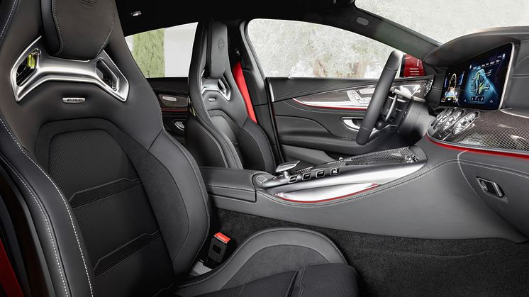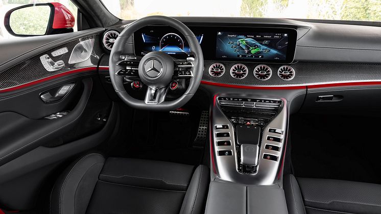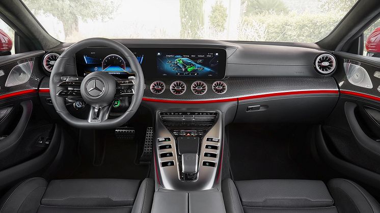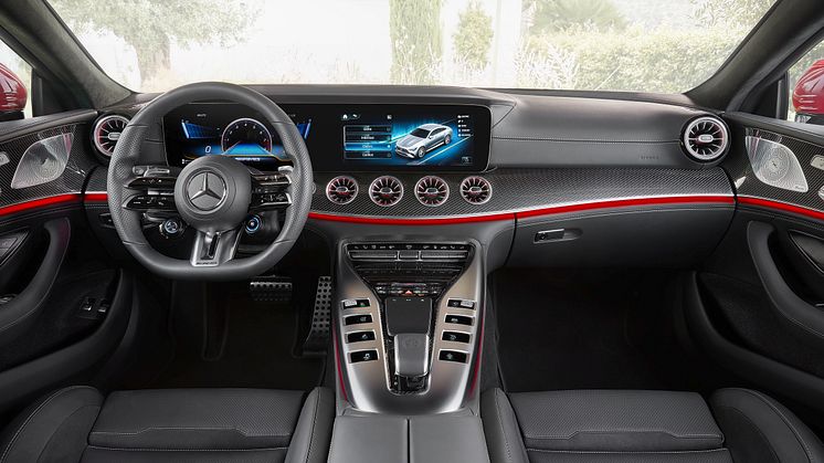 Mercedes-AMG GT 63 S E PERFORMANCE er repræsenterer foreløbig spydspidsen fra Mercedes-AMG, når det gælder performance til brug på offentlig vej og er blandt andet udstyret med nyeste generation af affjedringssystemet AMG RIDE CONTROL, mens kabinen blandt andet byder på MBUX med specifikke hybrid-displaydesigns og ikke færre end syv køreprogrammer, der gør det muligt at opsætte bilen præcis efter omgivelser, underlag og humør: