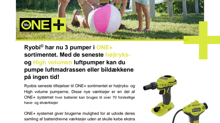 Ryobi© har nu 3 pumper i ONE+ sortimentet. Med de seneste højtryks- og High volumen luftpumper kan du pumpe luftmadrassen eller bildækkene på ingen tid!