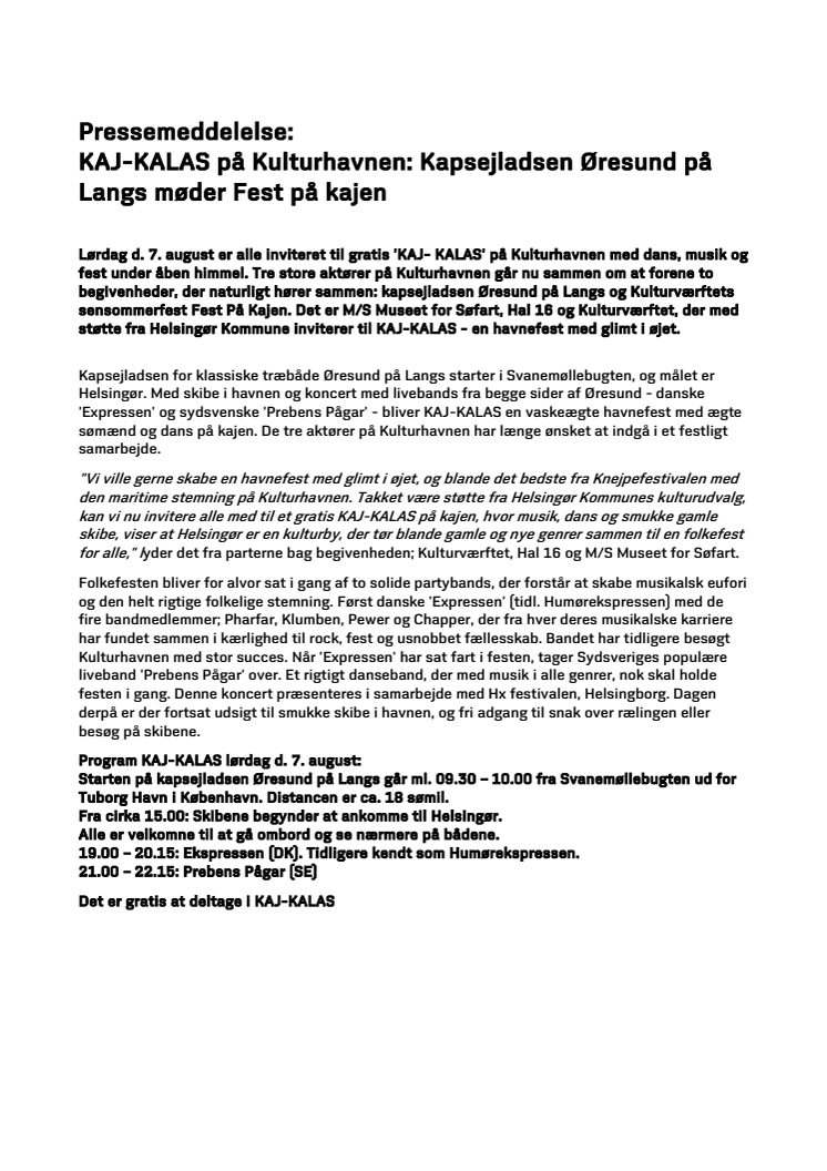 Lørdag d. 7. august er alle inviteret til gratis ’KAJ- KALAS’ på Kulturhavnen med dans, musik og fest under åben himmel. Tre store aktører på Kulturhavnen går nu sammen om at forene to begivenheder, der naturligt hører sammen: kapsejladsen Øresund på Langs og Kulturværftets sensommerfest Fest På Kajen.