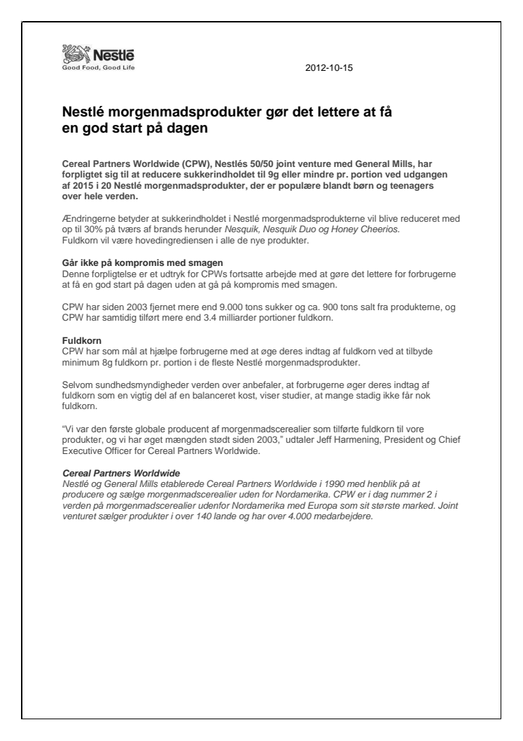 Millioner af familier verden over vil kunne øge deres indtag af fuldkorn om morgenen eftersom Nestlé forbedrer nogle af sine mest populære morgenmadsprodukter. Cereal Partners Worldwide (CPW), Nestlés 50/50 joint venture med General Mills, har forpligtet sig til at reducere sukkerindholdet til 9g eller mindre pr. portion ved udgangen af 2015 i 20 Nestlé morgenmadsprodukter.
