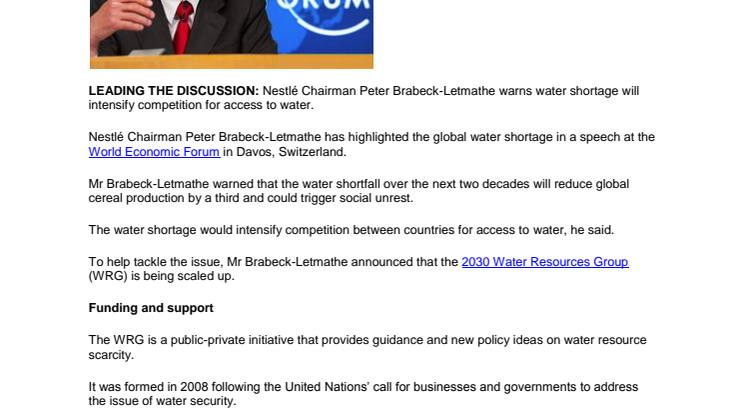 Nestlés bestyrelsesformand Peter Brabeck-Letmathe advarer om, at vandmangel i de kommende årtier vil kunne påvirke den globale cerealieproduktion, så den reduceres med en tredjedel og at dette ligeledes vil skabe sociale uroligheder og konkurrence mellem landene for at få adgang til vand. For at begynde at løse dette problem, slog Peter Brabeck- Letmathe et slag for at 2030 Water Resources Group bør forbedres.