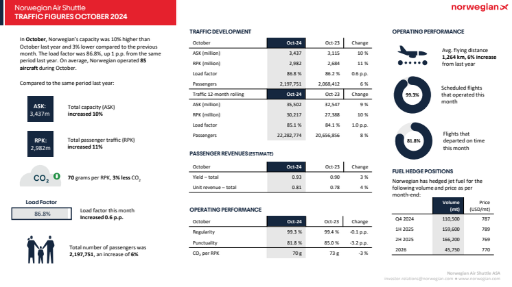 Norwegians kapacitet (ASK) var 3.437 millioner sædekilometer, en stigning på 10 procent fra samme periode sidste år. Den faktiske passagertrafik (RPK) var 2.982 sædekilometer, en stigning på 11 procent fra oktober 2023. Belægningsgraden steg med 0,6 procentpoint fra samme periode sidste år til 86,8 procent. I oktober blev 99,3 procent af de planlagte flyvninger gennemført. Punktligheden, målt i andelen af afgange inden for 15 minutter efter det planlagte tidspunkt, var 81,8 procent, hvilket er 3,2 procent lavere end i oktober sidste år, men en forbedring fra de seneste måneder. Norwegian havde i gennemsnit 85 fly i drift i oktober.