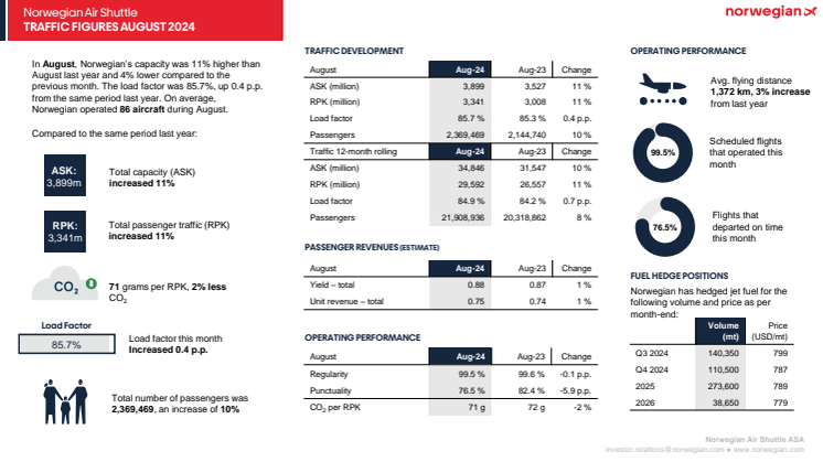 Norwegians kapacitet (ASK) var 3.899 millioner sædekilometer, en stigning på 11 procent fra samme periode sidste år. Faktisk passagertrafik (RPK) var 3.341 millioner sædekilometer, også en stigning på 11 procent fra august 2023. Belægningsgraden steg med 0,4 procentpoint fra august 2023 og endte på 85,7 procent. I august blev 99,5 procent af de planlagte flyvninger gennemført. Punktligheden, målt som antallet af afgange inden for 15 minutter af det planlagte tidspunkt, var 76,5 procent, hvilket er et fald på 5,9 procentpoint i forhold til august sidste år. Ikke desto mindre ankom 95,9 procent af alle flyvninger inden for 60 minutter efter den planlagte ankomsttid. Norwegian havde i gennemsnit 86 fly i drift i august.