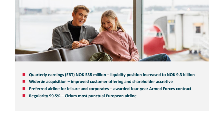 Norwegian leverede et driftsresultat (EBIT) på 651 millioner norske kroner i andet kvartal, som var præget af solid drift forud for de travleste rejsemåneder om sommeren. Videre offentliggjorde Norwegian og Strawberrys nylig etablerede loyalitetsselskab i dag, at Avida bliver selskabets foretrukne finansielle partner. Sammen med den nylig indgåede aftale om at købe Widerøe vil de nye partnerskaber bidrage til, at Norwegian kan levere endnu bedre og mere smidige rejseoplevelser.