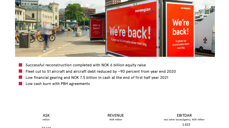 I andet kvartal 2021 afsluttede Norwegian en vellykket rekonstruktionsproces, der førte til, at selskabets egenkapital forøgedes til NOK 10,7 milliarder.