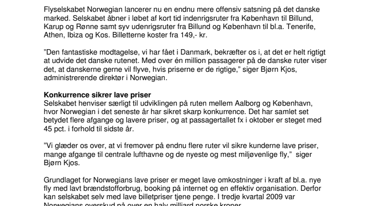 "Den fantastiske modtagelse, vi har fået i Danmark, bekræfter os i, at det er helt rigtigt at udvide det danske rutenet. Med over én million passagerer på de danske ruter viser det, at danskerne gerne vil flyve, hvis priserne er de rigtige," siger Bjørn Kjos, administrerende direktør i Norwegian.