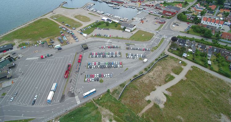 De to områder, hvor der er mulighed for boliger og havneaktiviteter sendes nu i udbud. Forrest til højre i billedet ses strandvillagrundene, mens der bagerst til venstre ses havnegrunden.