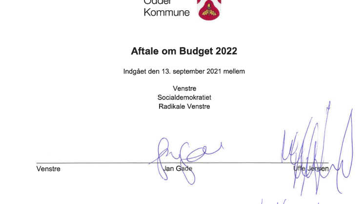 Odder Kommunes budget for 2022-2025 er nu kommet et stort skridt nærmere. Sent mandag eftermiddag gik de tilbageværende partier ud fra Mødelokale 1 på rådhuset med en budgetaftale i hånden, og det er en aftale der er præget af grøn udvikling, ekstra midler til velfærdsområderne for både ældre og voksne handicappede, og især til børn. Og selvom det var en aftale uden flere af byrådets partier, så glæder borgmester Uffe Jensen sig alligevel over aftalen.