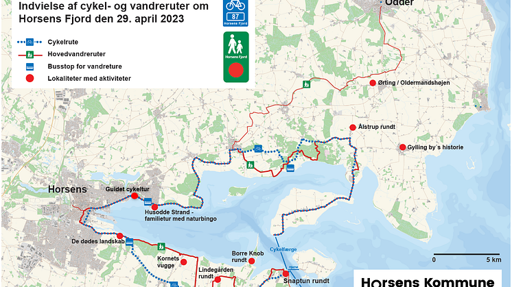 Nu bliver det for første gang nogensinde muligt at vandre eller cykle hele vejen rundt om Horsens fjord på særligt afmærkede ruter. Det fejrer de tre fjordkommuner i Odder, Horsens og Hedensted den 29. april. Her bliver de to nye ruter indviet med et væld af spændende aktiviteter, som viser, hvad fjordområdet bl.a. byder på.