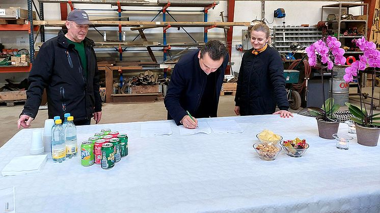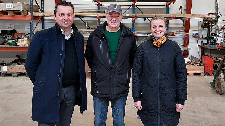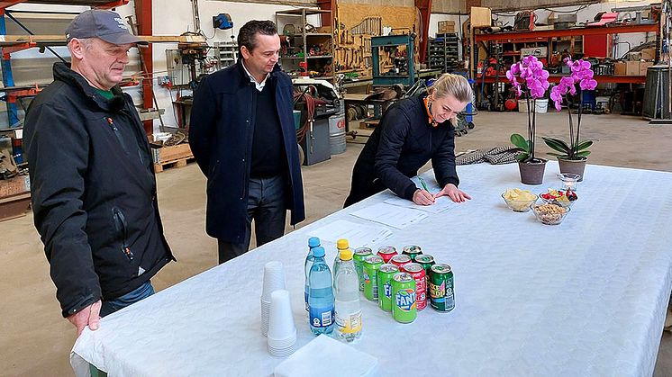 Aftalen blev underskrevet på Ole Larsens gård ved Mesing. Han står her i midten med Skanderborgs borgmester, Frands Fischer, til venstre og Odders borgmester, Lone Jakobi, til højre for sig.