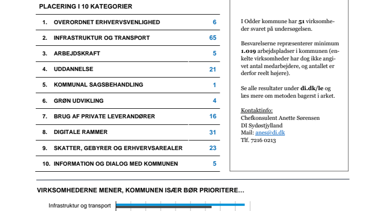 Noget af det gode ved målingen er, at den både fremhæver det, vi som kommune er gode til, og de steder, hvor vi kan blive endnu bedre, og den slags er også at spore i undersøgelsen. Højt på ønskesedlen for Odder Kommunes virksomheder står blandt andet at kommunen prioriterer at kigge infrastrukturen og arbejdskraften. Ifølge undersøgelsen følger det lokale erhvervsliv tendensen på landsplan, hvor samme fokus efterspørges.