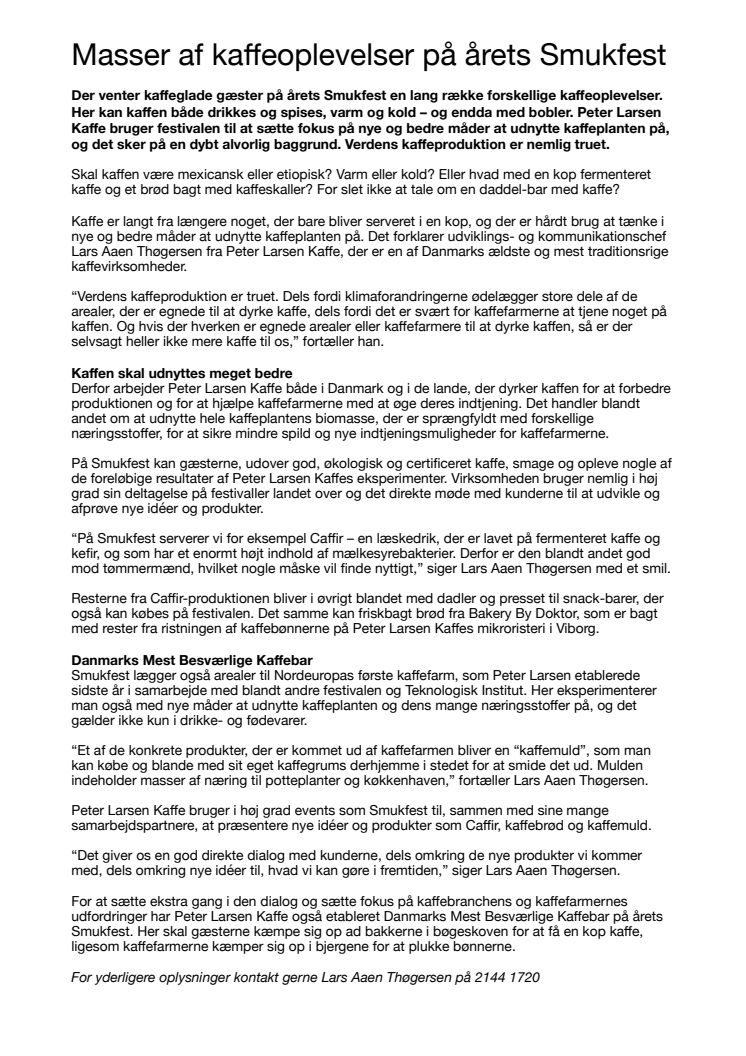 Der venter kaffeglade gæster på årets Smukfest en lang række forskellige kaffeoplevelser. Her kan kaffen både drikkes og spises, varm og kold – og endda med bobler. Peter Larsen Kaffe bruger festivalen til at sætte fokus på nye og bedre måder at udnytte kaffeplanten på, og det sker på en dybt alvorlig baggrund. Verdens kaffeproduktion er nemlig truet.