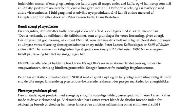 “Det er velkendt, at koffeinen i de kaffebønner, som er grundlaget for vores forretning, giver energi. Derfor giver det god mening, at vi med ENERGI, som den nye drik helt naturligt er blevet døbt, forsøger at udnytte vores råvare og dens egenskaber på en ny måde. Peter Larsen Kaffes slogan er Kaffe til folket siden 1902. Det kunne i virkeligheden lige så godt være Energi til folket siden 1902. Nu er energien hældt på flaske og har fået ny smag,” siger han.
