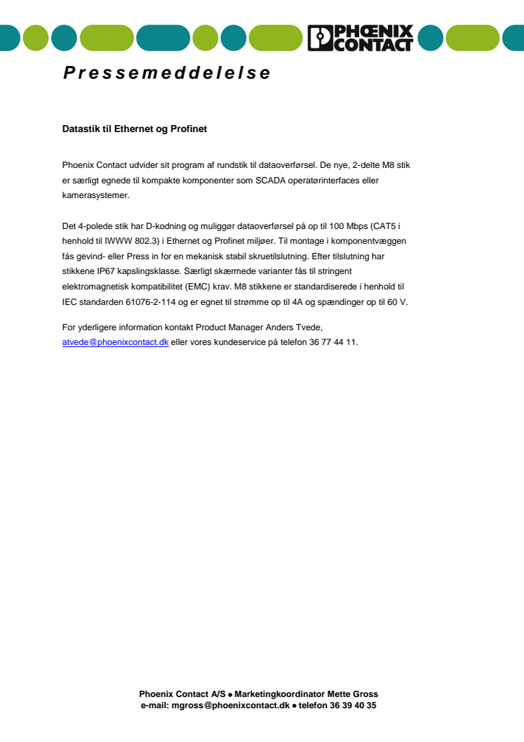 Phoenix Contact udvider sit program af rundstik til dataoverførsel. De nye, 2-delte M8 stik er særligt egnede til kompakte komponenter som SCADA operatørinterfaces eller kamerasystemer.