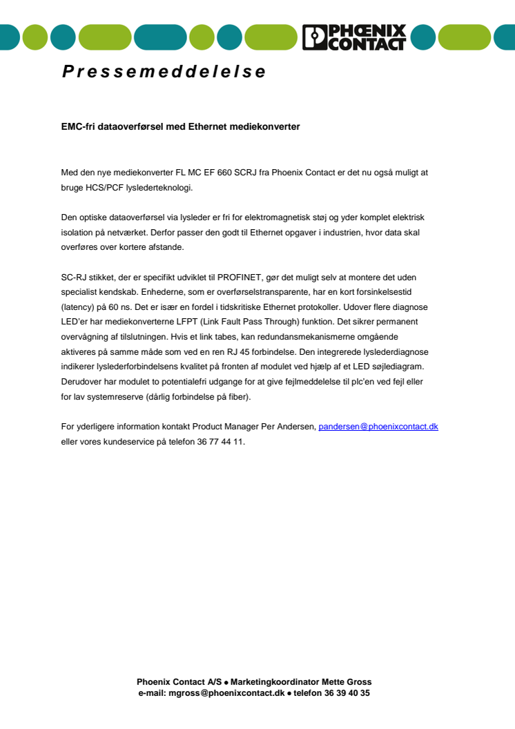 Med den nye mediekonverter FL MC EF 660 SCRJ fra Phoenix Contact er det nu også muligt at bruge HCS/PCF lyslederteknologi.