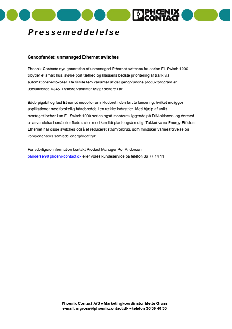 Phoenix Contacts nye generation af unmanaged Ethernet switches fra serien FL Switch 1000 tilbyder et smalt hus, større port tæthed og klassens bedste prioritering af trafik via automationsprotokoller. De første fem varianter af det genopfundne produktprogram er udelukkende RJ45. Lysledervarianter følger senere i år.