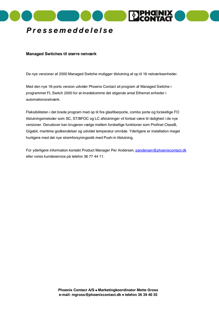 Med den nye 16-ports version udvider Phoenix Contact sit program af Managed Switche i programmet FL Switch 2000 for at imødekomme det stigende antal Ethernet enheder i automationsnetværk.