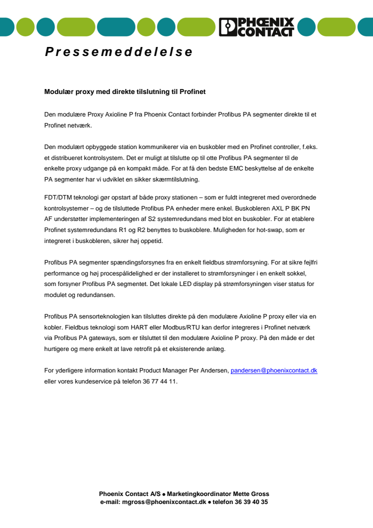 Den modulære Proxy Axioline P fra Phoenix Contact forbinder Profibus PA segmenter direkte til et Profinet netværk. Den modulært opbyggede station kommunikerer via en buskobler med en Profinet controller, f.eks. et distribueret kontrolsystem. Det er muligt at tilslutte op til otte Profibus PA segmenter til de enkelte proxy udgange på en kompakt måde.