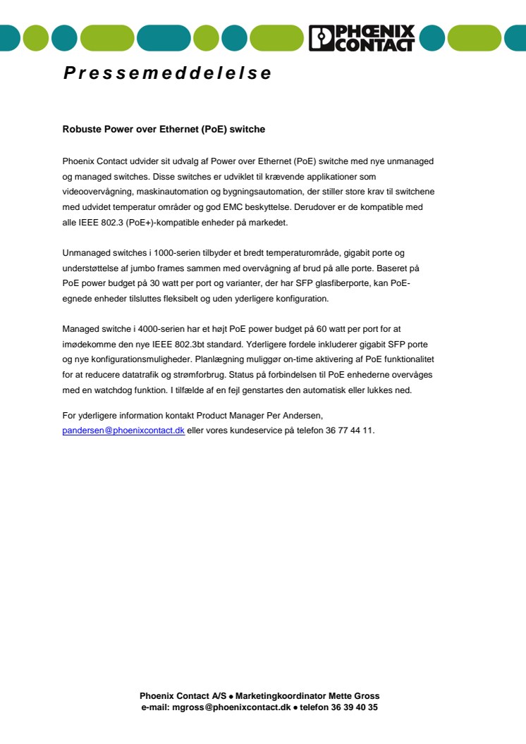 Phoenix Contact udvider sit udvalg af Power over Ethernet (PoE) switche med nye unmanaged og managed switches. Disse switches er udviklet til krævende applikationer som videoovervågning, maskinautomation og bygningsautomation.