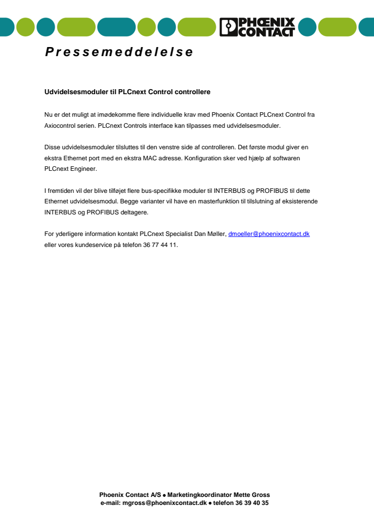 Nu er det muligt at imødekomme flere individuelle krav med Phoenix Contact PLCnext Control fra Axiocontrol serien. PLCnext Controls interface kan tilpasses med udvidelsesmoduler. Disse udvidelsesmoduler tilsluttes til den venstre side af controlleren. Det første modul giver en ekstra Ethernet port med en ekstra MAC adresse. Konfiguration sker ved hjælp af softwaren PLCnext Engineer.
