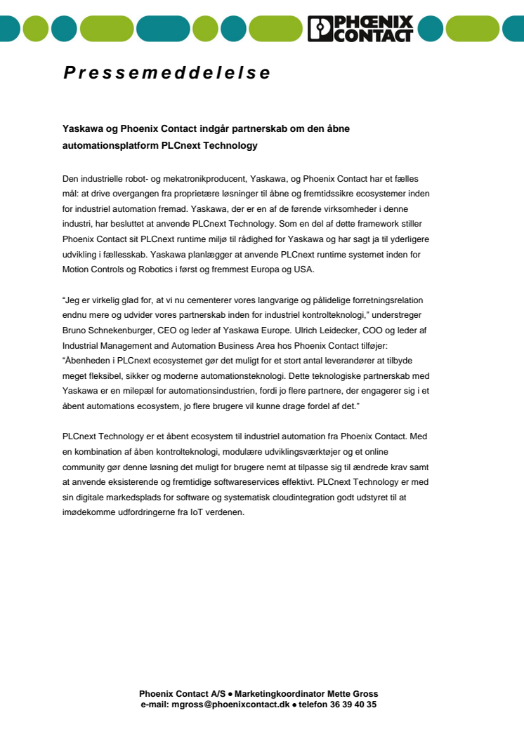 Yaskawa og Phoenix Contact indgår partnerskab om den åbne automationsplatform PLCnext Technology