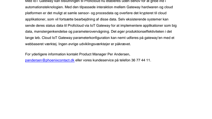 Med IoT Gateway kan tilslutningen til Proficloud nu etableres uden behov for at gribe ind i automationsteknologien. Med den tilpassede interaktion mellem Gateway hardwaren og cloud platformen er det muligt at samle sensor- og procesdata og overføre det krypteret til cloud applikationer, som vil fortsætte bearbejdning af disse data. Selv eksisterende systemer kan sende deres status data til Proficloud via IoT Gateway for at implementere applikationer som big data, mønstergenkendelse og parameterovervågning. Det øger produktionseffektiviteten i det lange løb. Cloud IoT Gateway parameterkonfiguration kan nemt udføres på gateway’en med et webbaseret værktøj. Ingen øvrige udviklingsværktøjer er påkrævet.