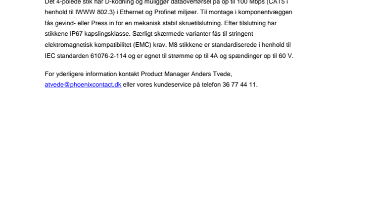 Det 4-polede stik har D-kodning og muliggør dataoverførsel på op til 100 Mbps (CAT5 i henhold til IWWW 802.3) i Ethernet og Profinet miljøer. Til montage i komponentvæggen fås gevind- eller Press in for en mekanisk stabil skruetilslutning. Efter tilslutning har stikkene IP67 kapslingsklasse. Særligt skærmede varianter fås til stringent elektromagnetisk kompatibilitet (EMC) krav. M8 stikkene er standardiserede i henhold til IEC standarden 61076-2-114 og er egnet til strømme op til 4A og spændinger op til 60 V.
