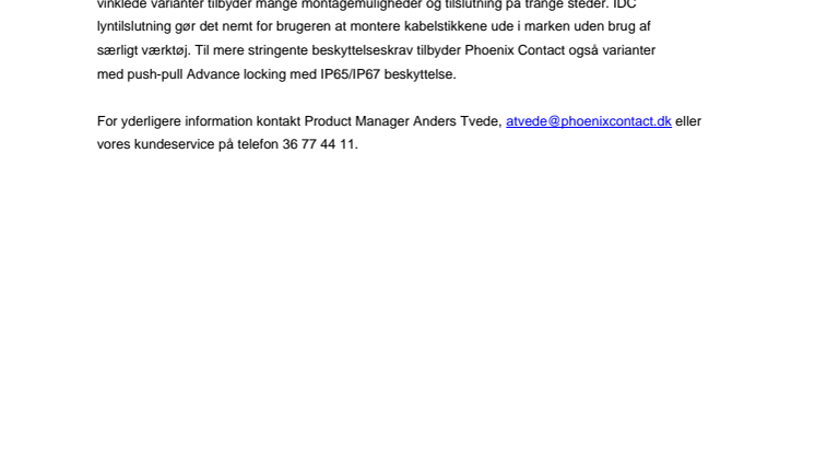 PHOENIX CONTACT er en af de markedsførende virksomheder i verden inden for elektronisk interface- og industriel automatiseringsteknik og beskæftiger mere end 15.000 medarbejdere i hele verden. Et netværk med 50 datterselskaber samt ca. 30 repræsentanter i Europa og oversøisk varetager det globale salg.