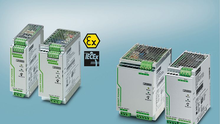 Udover de sædvanlige industrielle godkendelser overholder de dyplakerede moduler med nominelle strømme på 5 A og 10 A EN 60079-15 (ATEX direktivet). De kan installeres i potentielt eksplosive områder, hvor kategori 3G udstyr er påkrævet (II 3 G Ex nA nC IIC T4 Gc). Modulerne er også IECEx certificerede (Ex nA nC IIC T4 Gc). Alle QUINT Power enheder overholder UL standard ANSI/ISA 12.12.01 og specifikationerne for klasse I, division 2, grupper A, B, C og D (barske miljøer).