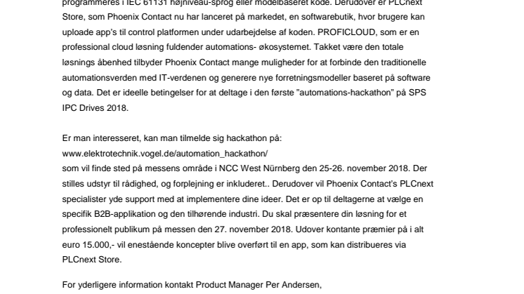 Er man interesseret, kan man tilmelde sig hackathon på: www.elektrotechnik.vogel.de/automation_hackathon/som vil finde sted på messens område i NCC West Nürnberg den 25-26. november 2018. Der stilles udstyr til rådighed, og forplejning er inkluderet.. Derudover vil Phoenix Contact’s PLCnext specialister yde support med at implementere dine ideer. Det er op til deltagerne at vælge en specifik B2B-applikation og den tilhørende industri. Du skal præsentere din løsning for et professionelt publikum på messen den 27. november 2018. Udover kontante præmier på i alt euro 15.000,- vil enestående koncepter blive overført til en app, som kan distribueres via PLCnext Store.