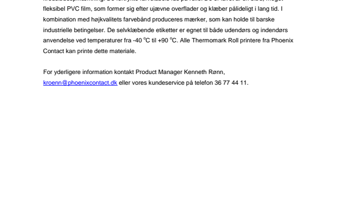 De nye selvklæbende advarsels- og fareetiketter gør det muligt for dig at lave brugerdefineret kredsløbsopmærkning. De fortrykte farvelabels fås på rulle. De er lavet af en blød, meget fleksibel PVC film, som former sig efter ujævne overflader og klæber pålideligt i lang tid. I kombination med højkvalitets farvebånd produceres mærker, som kan holde til barske industrielle betingelser. De selvklæbende etiketter er egnet til både udendørs og indendørs anvendelse ved temperaturer fra -40 oC til +90 oC. Alle Thermomark Roll printere fra Phoenix Contact kan printe dette materiale.