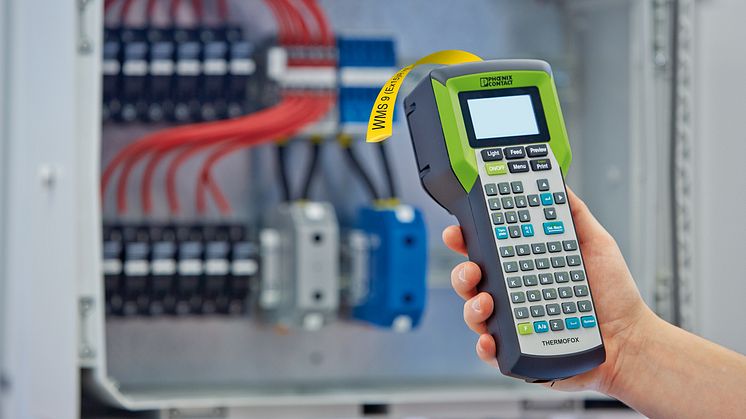 Termoprinteren Thermofox til endeløse materialer fra Phoenix Contact er en brugervenlig, bærbar opmærkningsenhed til hurtig anvendelse overalt. Materialer i rulleformat f.eks. mærker, skilte og krympeslanger kan opmærkes til kabler, ledere, enheder, klemmer og systemer.