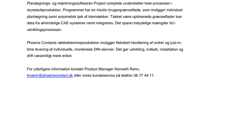 Phoenix Contacts rækkeklemmeproduktion muliggør fleksibel håndtering af ordrer og just-in-time levering af individuelle, monterede DIN-skinner. Det gør udvikling, indkøb, installation og drift væsentligt mere enkel.