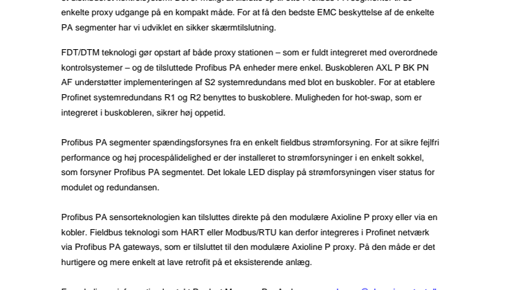 FDT/DTM teknologi gør opstart af både proxy stationen – som er fuldt integreret med overordnede kontrolsystemer – og de tilsluttede Profibus PA enheder mere enkel. Buskobleren AXL P BK PN AF understøtter implementeringen af S2 systemredundans med blot en buskobler. For at etablere Profinet systemredundans R1 og R2 benyttes to buskoblere. Muligheden for hot-swap, som er integreret i buskobleren, sikrer høj oppetid.