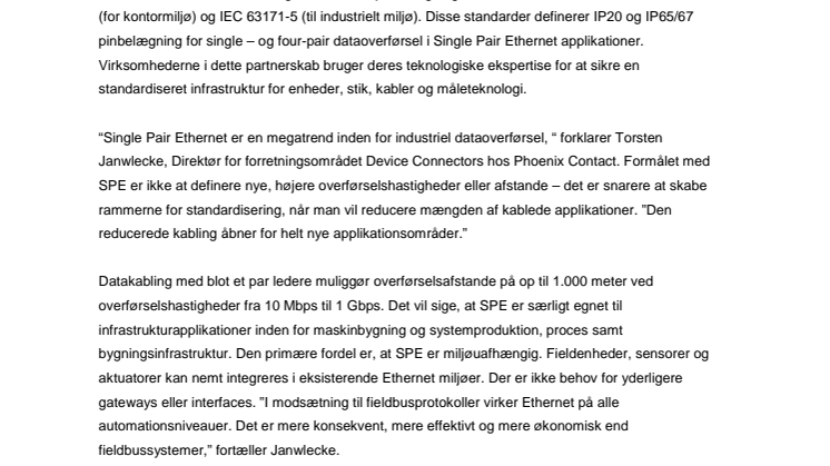 “Single Pair Ethernet er en megatrend inden for industriel dataoverførsel, “ forklarer Torsten Janwlecke, Direktør for forretningsområdet Device Connectors hos Phoenix Contact. Formålet med SPE er ikke at definere nye, højere overførselshastigheder eller afstande – det er snarere at skabe rammerne for standardisering, når man vil reducere mængden af kablede applikationer. ”Den reducerede kabling åbner for helt nye applikationsområder.”