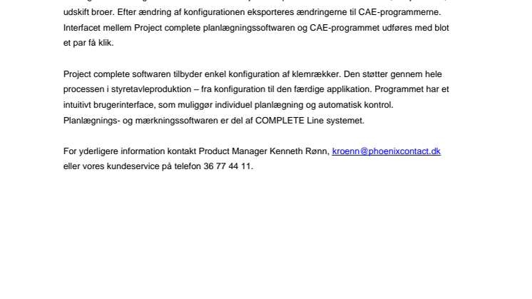 Project complete softwaren tilbyder enkel konfiguration af klemrækker. Den støtter gennem hele processen i styretavleproduktion – fra konfiguration til den færdige applikation. Programmet har et intuitivt brugerinterface, som muliggør individuel planlægning og automatisk kontrol. Planlægnings- og mærkningssoftwaren er del af COMPLETE Line systemet.